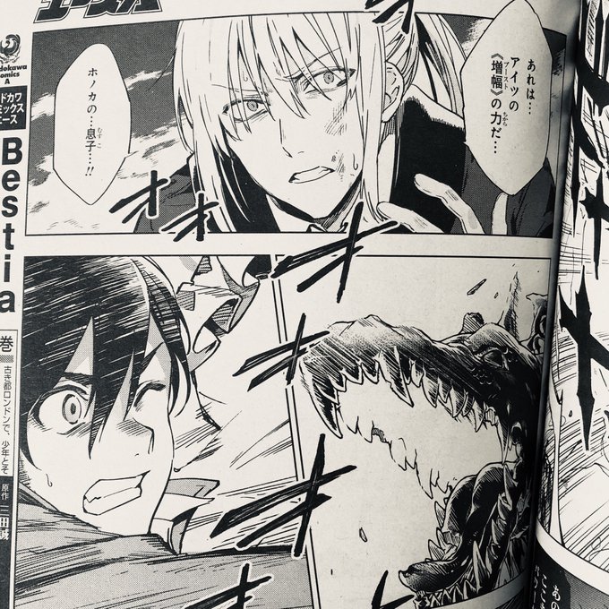 少年エース V Twitter 三田誠先生 みやこかしわ先生 有坂あこ先生が描くロンドン幻獣幻想譚 Bestia ベスティア エドガーとアリスの前に現れた黒猫 シェビティ 因縁をつけ 恐ろしきベスティアで攻撃を仕掛けてきた そのころ二人の危機を察した飛鳥と