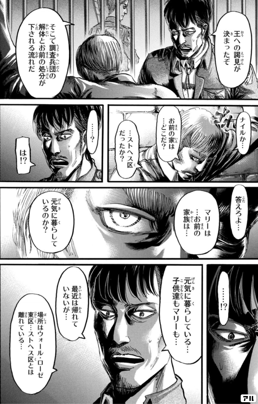 王への謁見が決まったぞ そこで調査兵団の解体とお前の処分が下される流れだ ナイルか お前の家は どこだ ストヘス区だったか は 答えろよ マリーは お前の家族は 元気に暮らしているのか 元気に